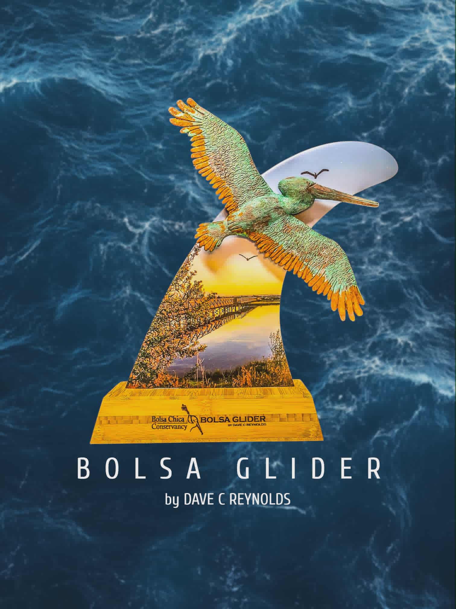 I call this special piece "Bolsa Glider". This creation combines 3 things that I love! Surfing, pelicans and Bolsa Chica! Pelicans have always been my favorite bird. I love watching them soar over the water surface riding the wave created updrafts. I have an extensive love and history with Bolsa Chica and surf or paddle there most days. The pelican sculpture I created has a 10 inch wingspan and has a unique copper and rust patina. Printed on the actual surfboard fin is a photo of the bridge at the Bolsa Chica Wetlands. Digitally rendered by my pal and digital expert James Dombrowski. The base is made from bamboo panel. Bolsa Chica Conservancy logo and Bolsa Glider are laser etched on the base. I used all my trophy designing and art skills to produce this special art piece. These are only available through this site. A significant portion of each sale benefits the Bolsa Chica Conservancy and their efforts to preserve our beloved Bolsa Chica forever!