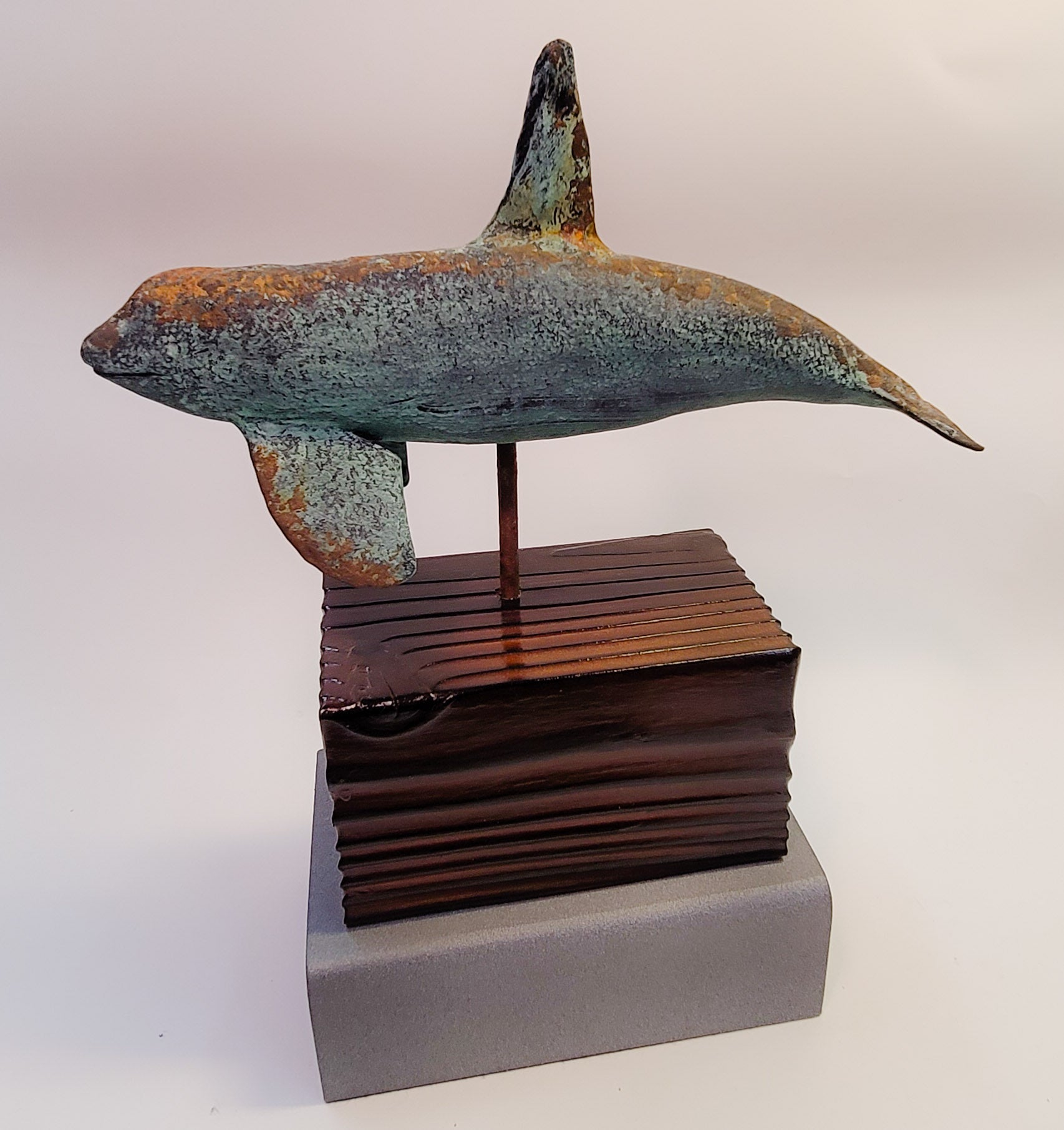 A beautiful representation of the ocean's apex predator...the Orca. Actual copper and iron/rust coating over resin cast. Because of the patina effect I create every piece is slightly different. No two alike. Custom burnt wood and resin base. Weighs 4.8 pounds. Stands 13 inches high. Orca is 11 inches long. Comes with a signed Certificate of Authenticity.