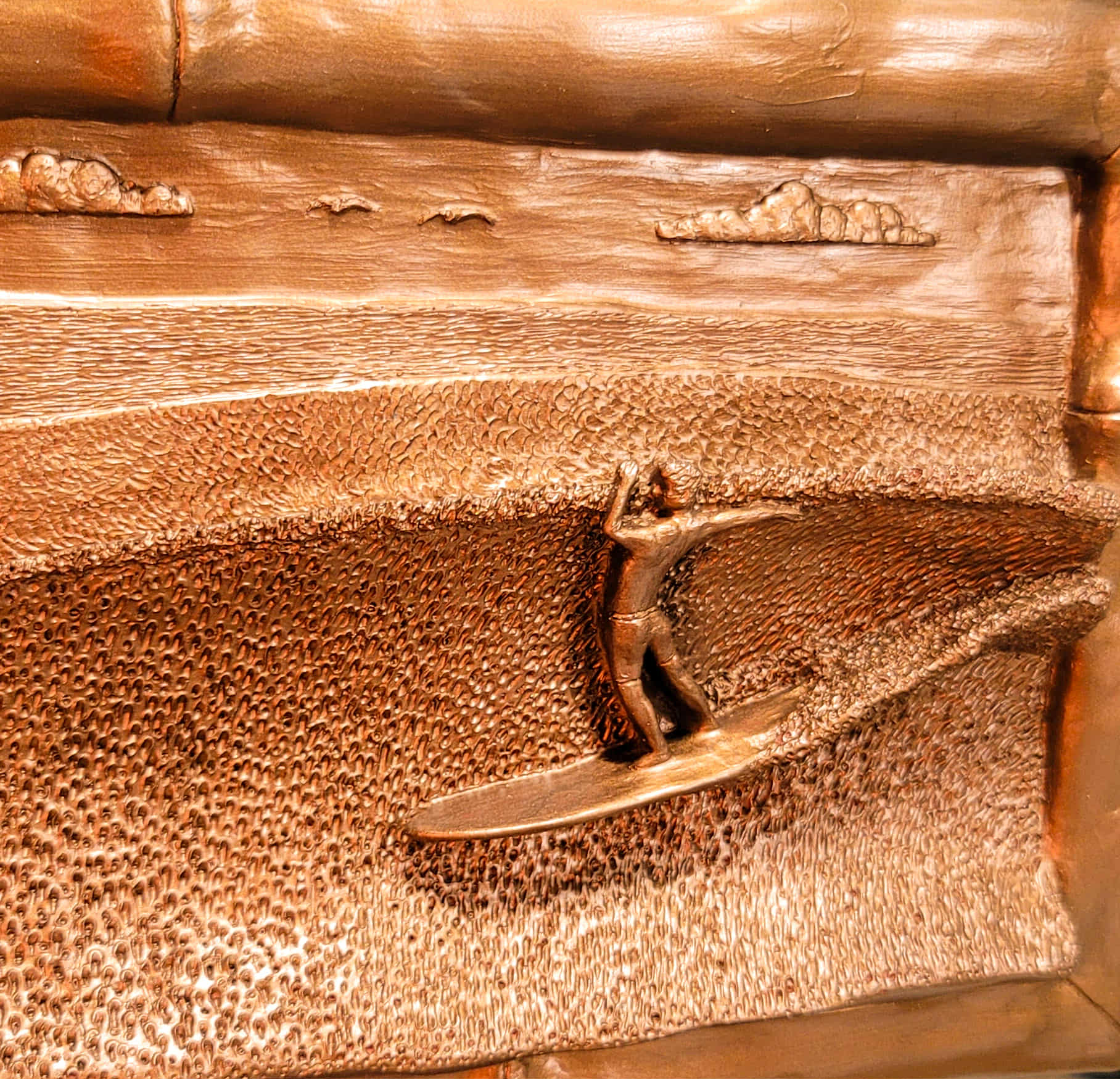 This piece I call "Rincon Soul". This high relief sculpture depicts the classic surf style of the 1960's. This piece is inspired by Kemp Aaberg and his classic Rincon "soul arch". This sculpture was used to create several world class trophies and events. Sculpture is 6" x 8", total height 11". The bamboo border was sculpted into the piece. Has an actual bronze metal coating on the front. Looks exactly like a solid bronze casting at a fraction of the price. Mounted above a custom wood block with Shou Sugi Ban Japanese wood treatment done to it. A wood burning technique that leaves the raised and unique wood grains you see. Satin finish on base. As you can see I have utilized my world class surf trophy designs and skills to produce these. Limited to 100 castings. Each piece is signed and numbered on the back. You also get a signed and numbered Certificate of Authenticity.