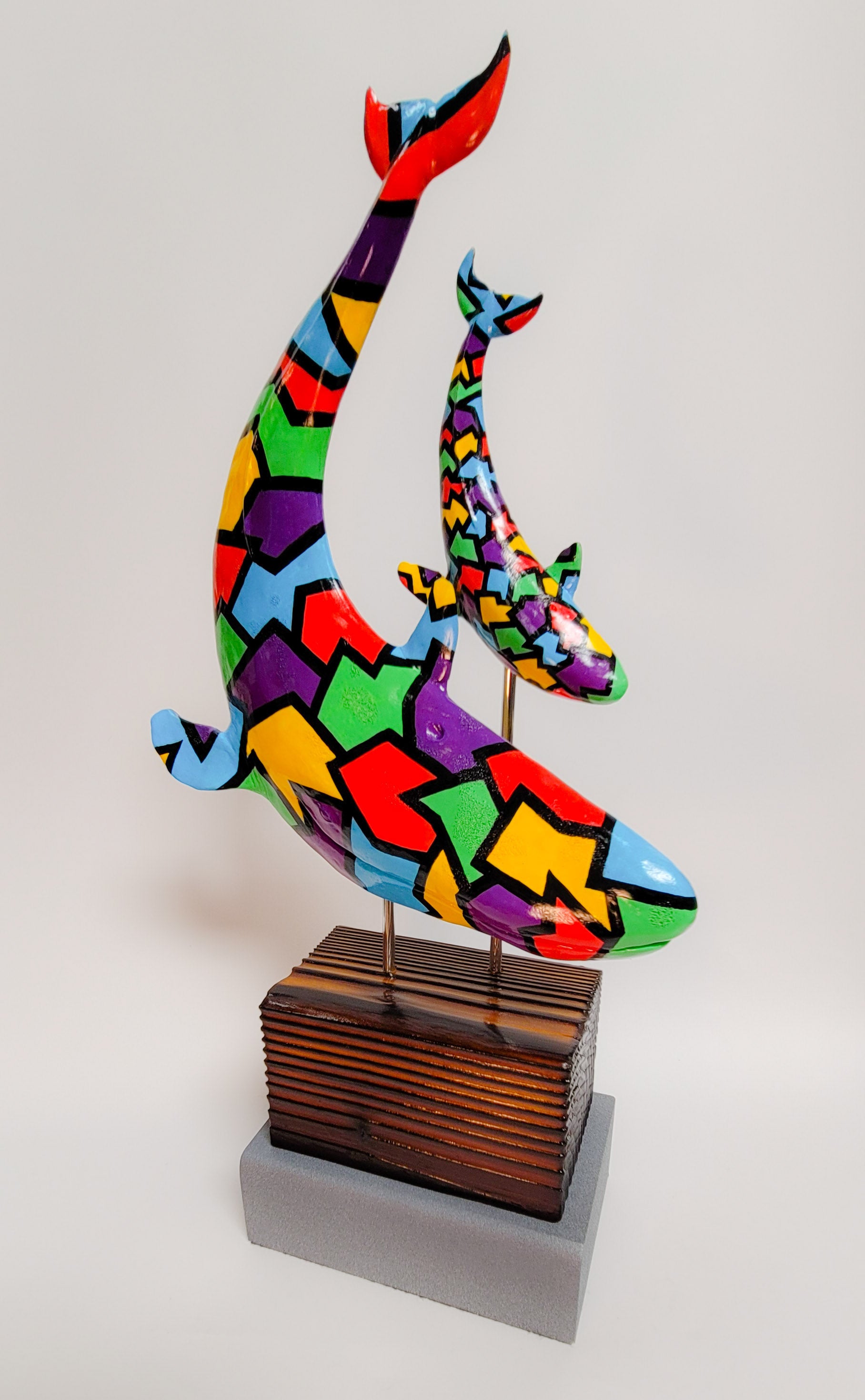 This is one of my more wild ideas. Called "Shattered Greys". I hand painted my Shattered graphics on one of my most popular marine life sculptures. I have painted my Shattered graphics on many things now. Grey whale mother and calf. Mounted on one of my custom burnt wood and resin bases. Whales are mounted on polished aluminum rods. Stands 20 inches high. Weighs 5.5 pounds. One of a kind piece for sure. Includes signed Certificate of Authenticity.