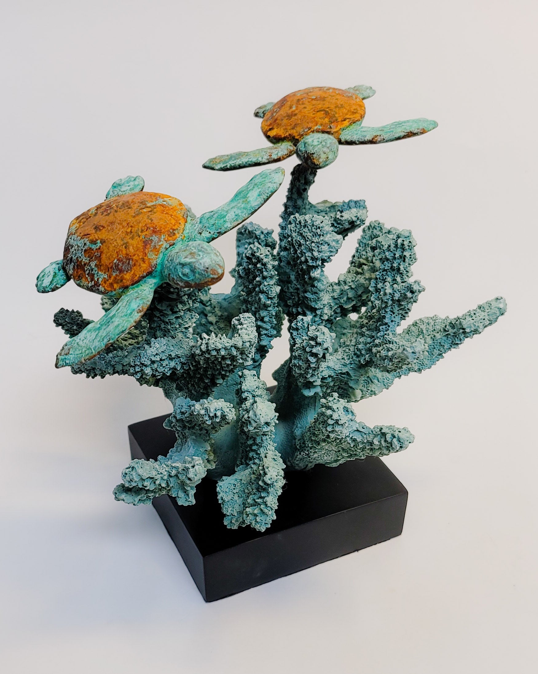 This might be one of my cutest True Locals pieces. Called "Baby Turtle Cove". Resin cast coral and baby turtles. The actual size baby turtles have a rust and copper patina. They appear to be soaring over the coral on their way to sea. 7 inches high.